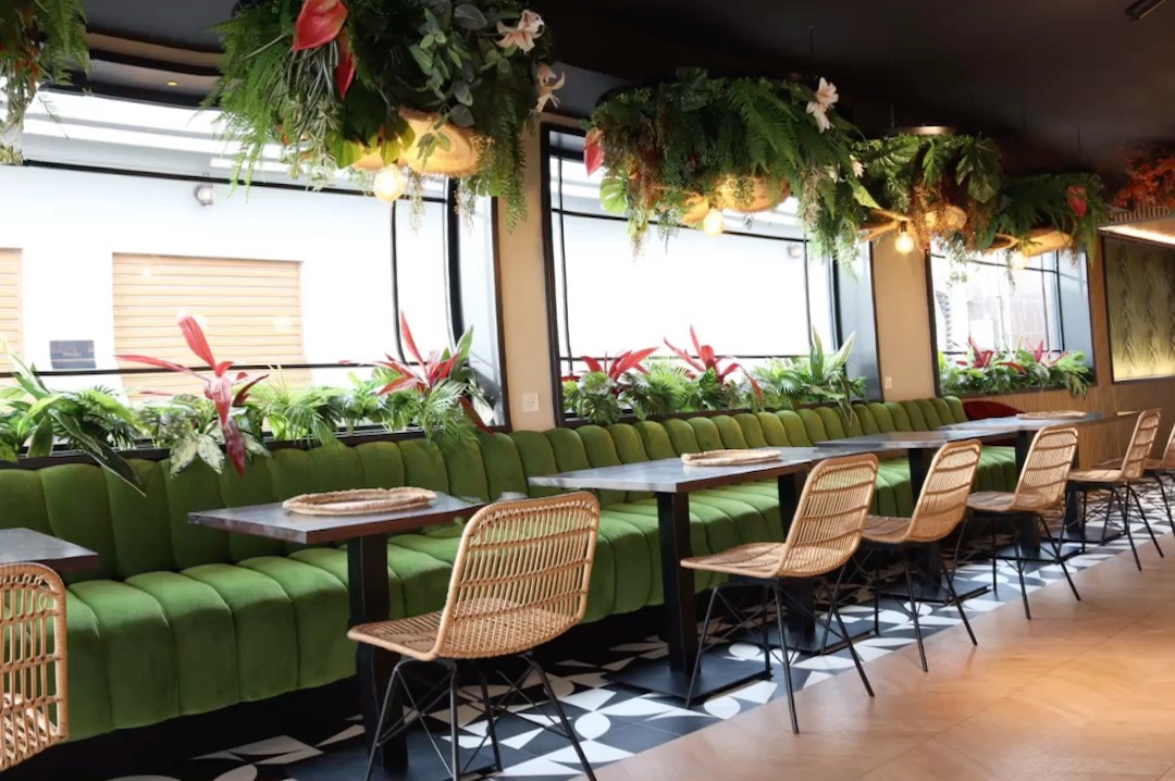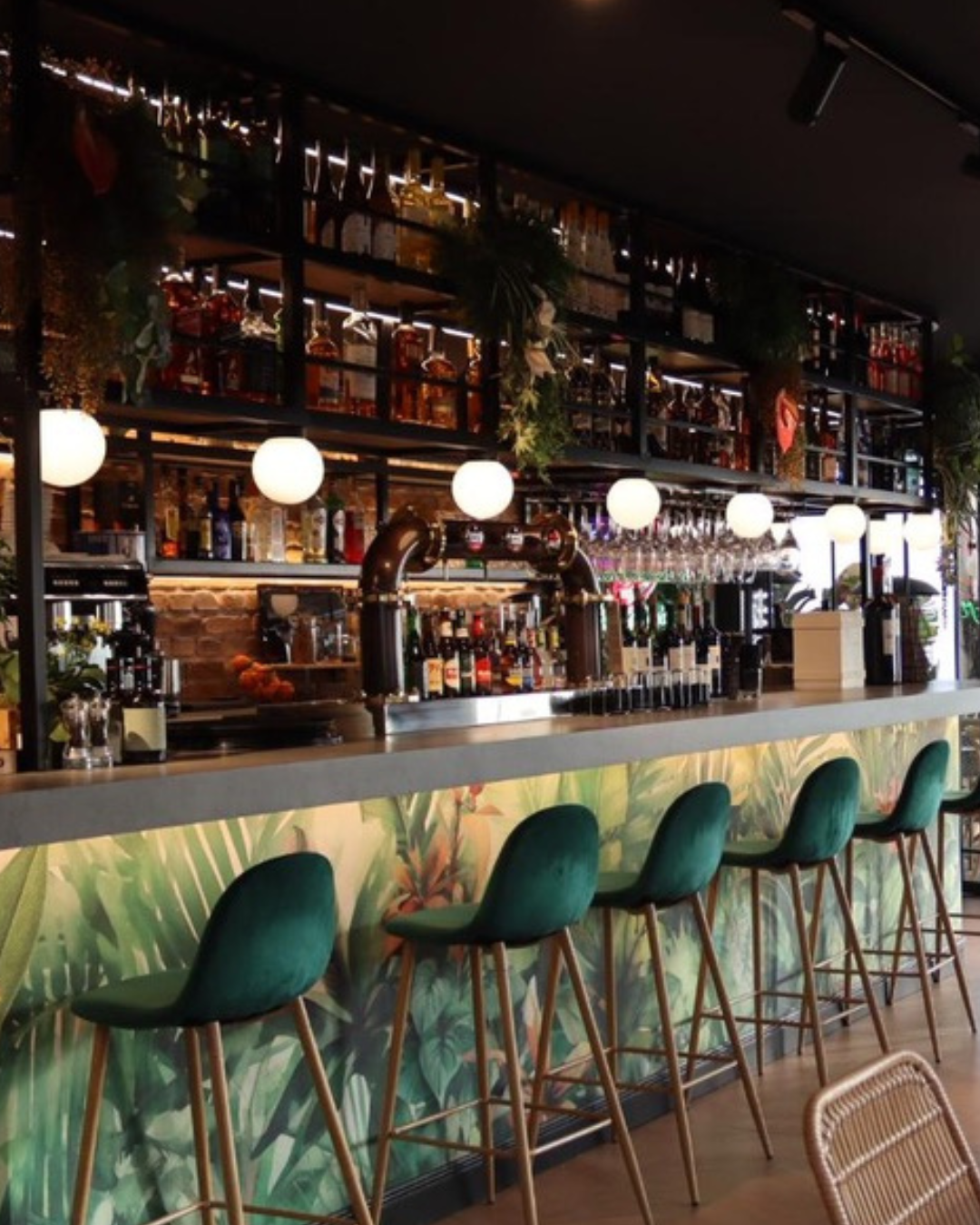 En la zona de la barra también hemos dejado nuestra huella. Y es que quien conoce nuestro taburete GALA en terciopelo, se enamora. Si no nos crees, pregúntaselo a nuestros clientes del restaurante Al Tucán, quienes eligieron este modelo en un color verde jungla muy favorecedor. La estructura metálica, que imita la madera, continúa la línea natural que predomina en todo el establecimiento.
